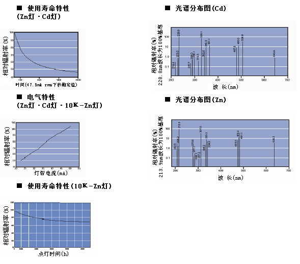 ※1 最大輻射波長為0.1sec條件下的數據。 ※2 自啟動1小時后的穩定溫度條件下的相關數據。 ※3 達到峰值輻射所需時間。 warranty:使用一年或1000小時后的最小輻射強度在初始值50%以上。 10K-Zinc燈則定義為使用18個月或者2500小時后的最小輻射強度在初始值50%以上。 (上述數值均為使用BHK專用電源或BHK推薦電源條件下的參考值) |