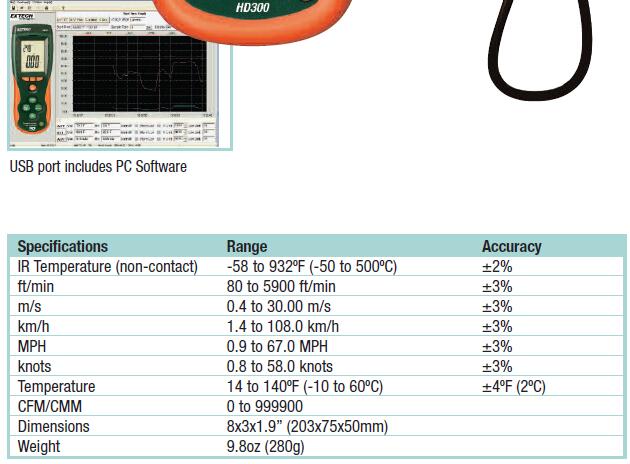 美國Extech HD300葉輪風速儀風速測量范圍:0.4~30m/s,可測量并顯示風速,氣流量,氣溫和表面溫度(采用內置非接觸式紅外線溫度計)。可測量高達500℃的遠程表面溫度。