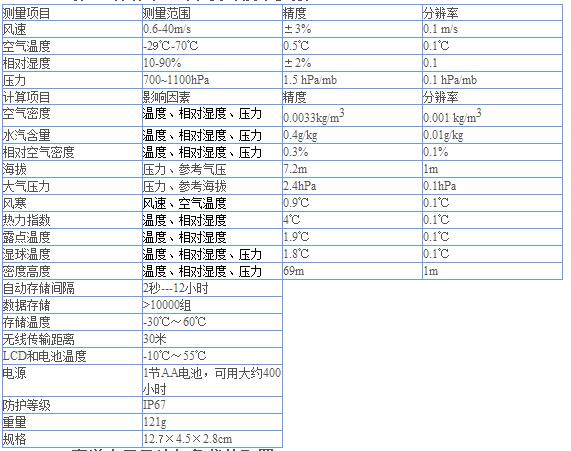 • 測量:蒸發速率、空氣流量、空氣體積、空氣密度、相對空氣密度、Delta-T等 • 大屏幕,高分辨率,高對比度,數據圖表顯示,在明亮的陽光下具有較好的可讀性,具有背光,可以夜晚使用。 • 手持便攜式氣象站,具有數據存儲功能,數據制表功能。 • 可選由Bluetooth Smart® 提供的LiNK,可以通過無線與手機或電腦進行連接 • 堅固耐用(跌落測試符合MIL-STD-810G標準),完全防水(防護等級IP67),能夠漂浮在水上。 • 配件包含:保護袋,頸繩,AA鋰電池 2年保修。