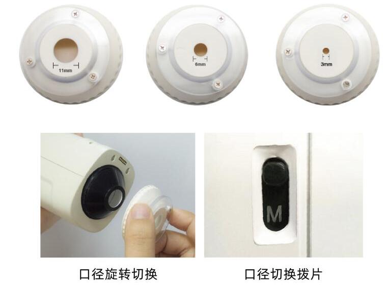 (6)提供三口徑切換(11mm,6mm,3mm) 旋轉(zhuǎn)即可切換口徑,告別了繁瑣的手動(dòng)擰螺絲固定口徑方式。 大口徑(Φ11mm)撥到“M”檔。 小口徑(Φ6mm、Φ3mm)撥到“S”檔。