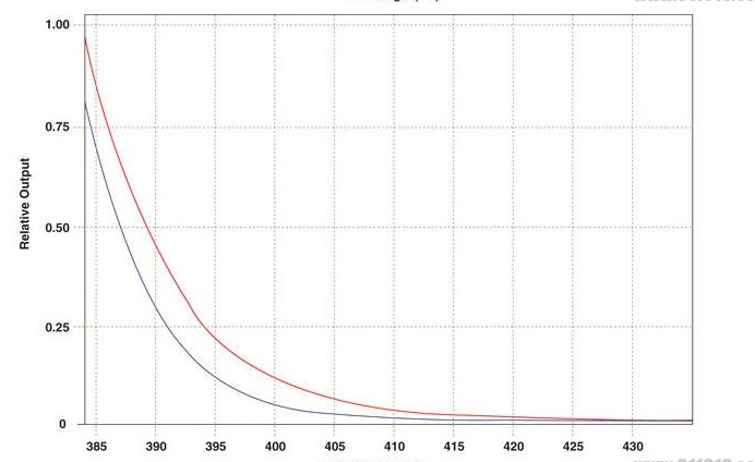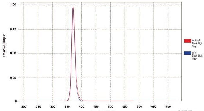 名義紫外照射 OPTI-LUX™ 365典型波長輸出圖,紅色為不配黑色濾色片的波長輸出,藍(lán)色為配黑色濾色片的濾長輸出,峰值都是365nm。 配及不配內(nèi)置黑色濾色片時波長輸出 當(dāng) OPTI-LUX™ 365的波長進(jìn)入可見光范圍時,在400nm波長時,配有黑色濾色片可顯著降低強度達(dá)50%。